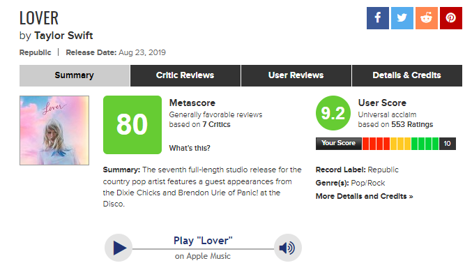 Lover Gets A Metascore Of 80 From Critics Taylorswift