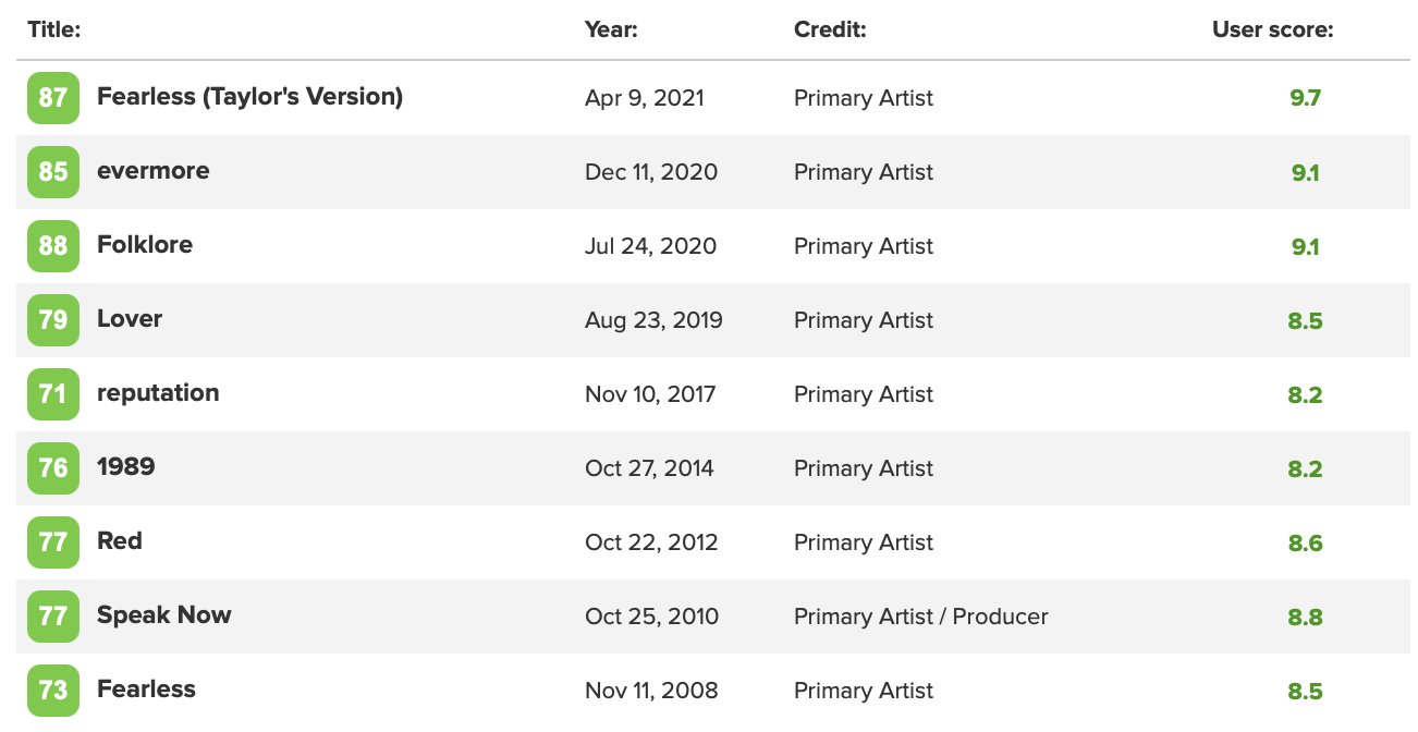 Taylor Swift Facts On Twitter Taylor Swift S Evermore Album Has Debuted With An Excellent Score Of 84 On Metacritic Based On 4 Critics It Is Her 8th Consecutive Positive Green Metascore In